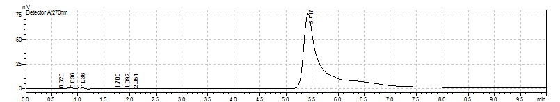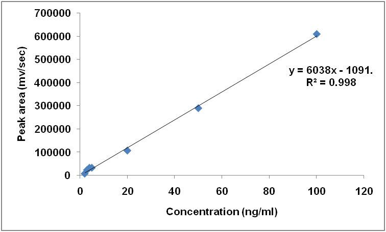 The calibration curve was plotted between peak area and concentration (ng/ml) as shown in fig. 1. The linearity was seen at a concentration range of 2.5 to 100 ng/ml with a regression coefficient (R2) value of 0.998. The retention time was found to be 5.4±0.34 min as shown in fig. 2.