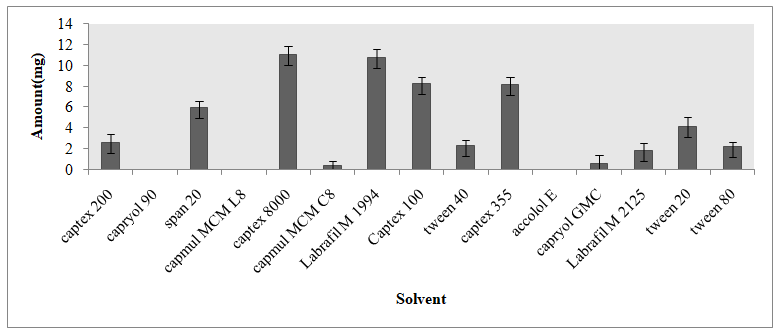 The solubility of IND in various oils, surfactants and co-surfactants were depicted in fig. 3. Among oils, captex 8000 showed very good solubility. Therefore, it was selected as the oil phase. Among surfactants and co-surfactants, IND had the highest solubility in span 20 and tween 20; hence they were selected as surfactant and co-surfactant respectively for the phase study.