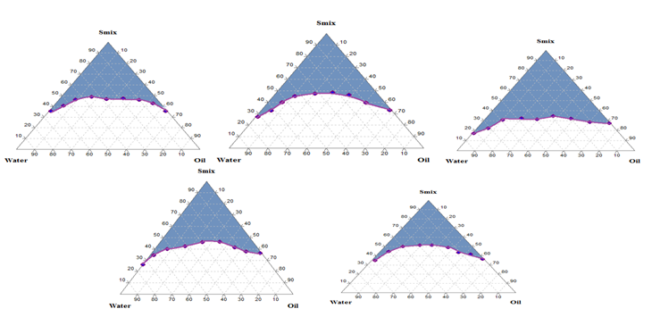 Fig. 4: Ternary phase diagrams for Smix ratios (1:1, 1:2, 1:3, 2:1 and 3:1 from right to left)