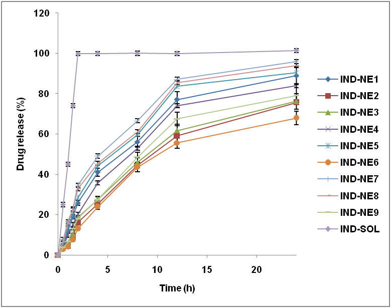 Fig. 5: In vitro drug release profiles, *error bars represent standard deviations of three replicates