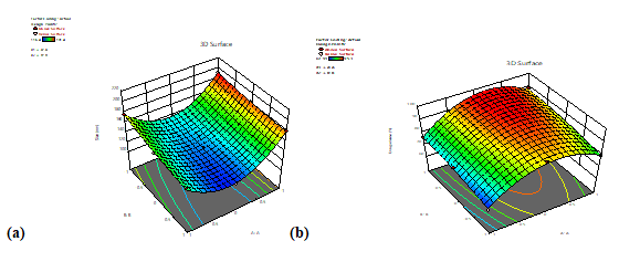 Fig. 6: 3D Response surface plots showing the effect of oil and Smix content on (a) mean globule size (nm), (b) Drug release (%)