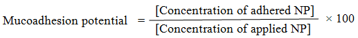 The ex vivo bioadhesion property of nanoparticles was performed on a fresh sheep nasal mucosa. Freshly excised sheep nasal mucosa was procured from the local slaughterhouse, cleaned with isotonic saline solution and cut into a piece of 2 cm2 for the study. The topiramate nanoparticles (100 mg) were applied on the mucosal surface and attached on a polyethylene plate. Simulated nasal electrolyte solution (100 ml) was poured on nanoparticles. Further, it was incubated in desiccators at 90% relative humidity for 15 min so as the polymer interact with the membrane. Further, the plate was kept at an angle of 45 ° relative to the horizontal plane. Phosphate buffer pH 6.8 (37 °C) was peristaltically pumped (5 ml/min) over the tissue and the perfusate was collected. The amount of topiramate in the collected perfusate was estimated after 1 hour spectrophotometrically. The amount of nanoparticles corresponding to the amount of drug in the perfusate was determined. The amount of adhered nanoparticles was calculated as the difference between the amount of nanoparticles applied and the amount of nanoparticles washed off with perfusate. The percent mucoadhesion was determined by the given equation [15],