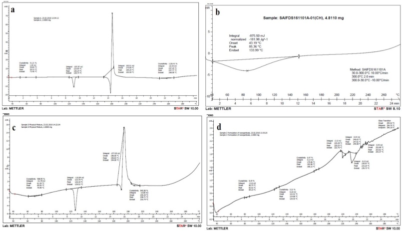 Fig. 4: DSC thermogram of a. Topiramate, b. Chitosan, c. physical mixture of chitosan and topiramate, d. topiramate loaded chitosan nanoparticles