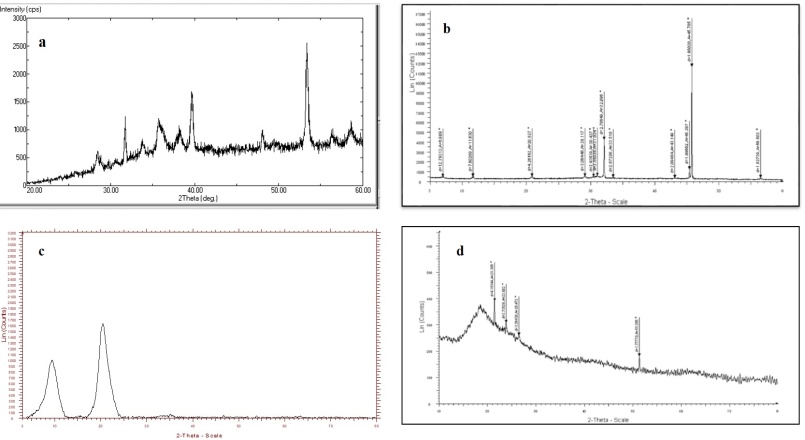 Fig. 5: X-ray diffractogram of a. topiramate, b. chitosan, c. physical mixture of topiramate and chitosan, d. topiramate loaded chitosan nanoparticles