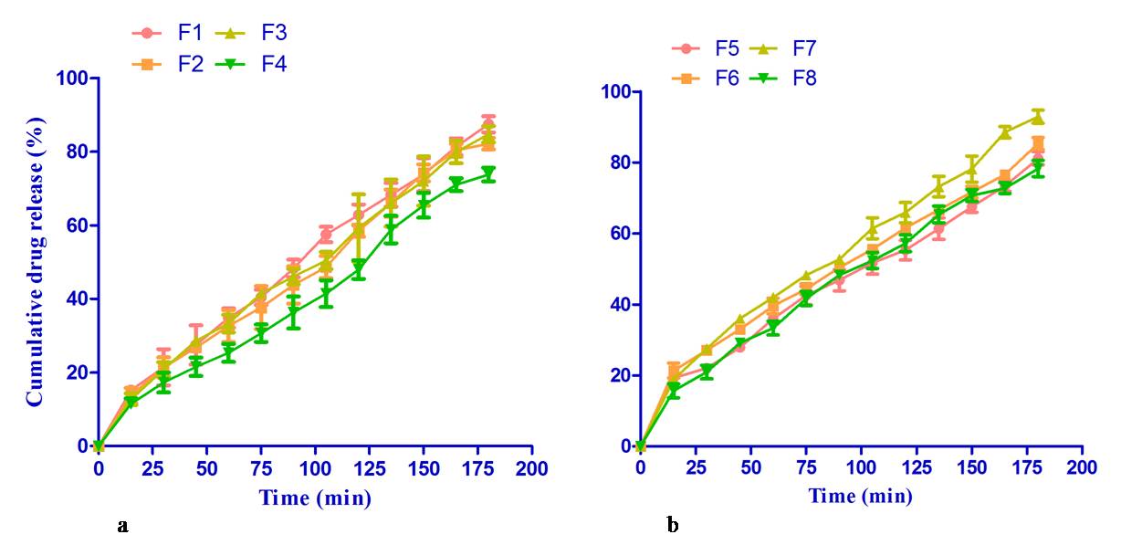 Fig. 6: In vitro drug diffusion study of topiramate loaded chitosan nanoparticles (a: F1 to F4 and b: F5 to F8)