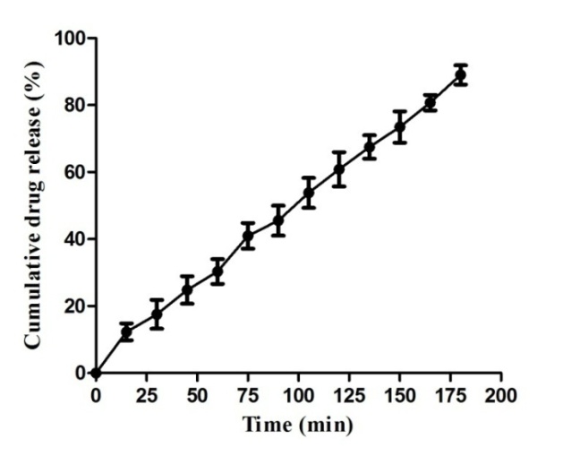 The ex–vivo permeation study was carried out for the optimized formulation i.e. F7 based on the results of the in vitro drug diffusion. The permeation of topiramate from nanoparticles of batch F7 was found to be 89.03% after 180 min as shown in fig. 7. Cationic bioadhesive polymeric material i.e., chitosan, can be used to enhance the drug dissolution and absorption through nanoparticles formulations of drugs for intranasal administration [28]. The Smaller particle size of nanoparticles provides the larger surface area and thus enhances the drug release from the formulations.