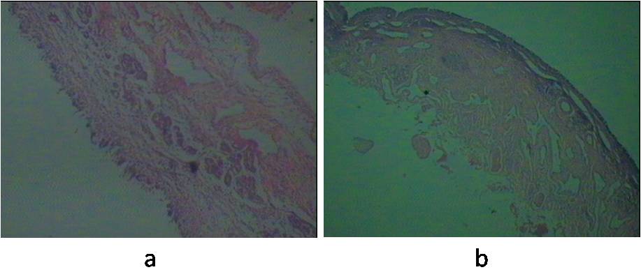 Fig. 8: Histopathological specimen of A) untreated nasal mucosa, B) topiramate loaded chitosan nanoparticles treated nasal mucosa