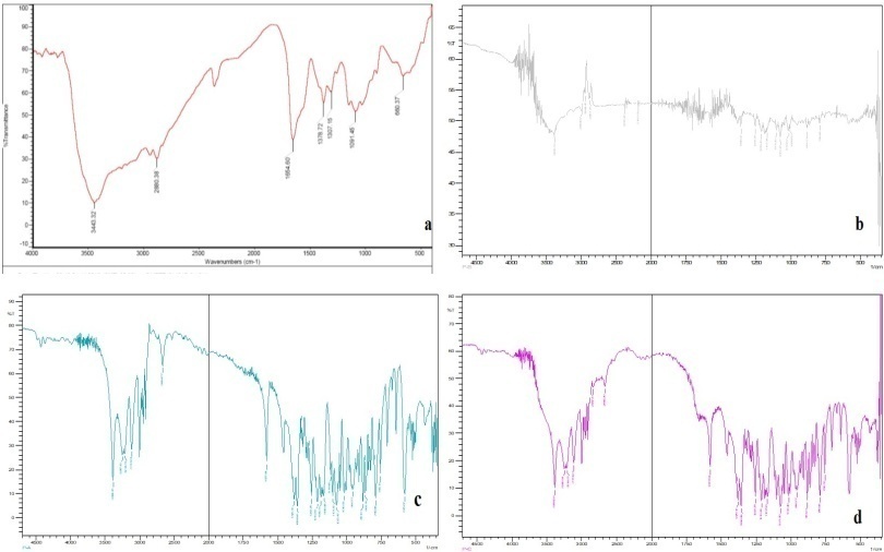 Fig. 3: FTIR spectrum of a. chitosan, b. topiramate, c. a physical mixture of topiramate and chitosan, d. topiramate loaded chitosan nanoparticles
