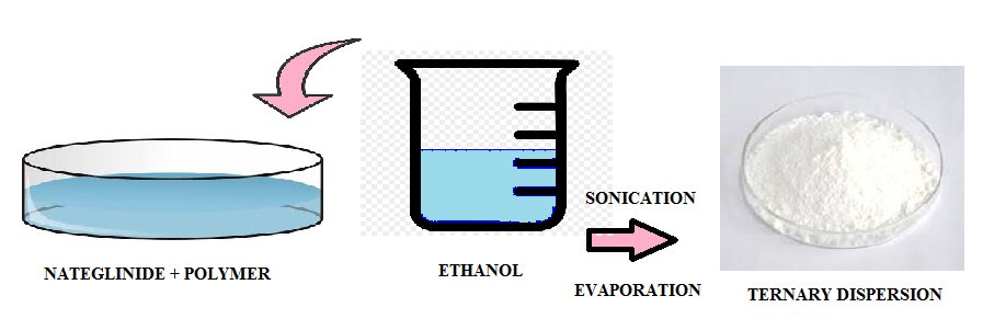 A weighed amount of nateglinide and polymer were mixed, dissolved in common solvent ethanol; the mixture was then sonicated for 10-20 min using ultra-probe sonication Model Frontline Sonicator FS-250 (Ahmedabad, India) to prepare the homogenous Solution later the solvent evaporated at room temperature. Nateglinide and polymers were dissolved in ethanol in different ratios (1:1,1:2, 1:3.1:4) to prepare SD by the solvent evaporation technique until we find the best proportion of drug and polymer. The prepared complexes were studied for solubility. In this same way, complexes were prepared with Soluplus, βCD, HPβCD, and Affinisol. Solubility for all prepared complexes was determined and the best ratios of the drug: polymer was decided. To formulate a ternary complex, a binary complex with the best solubility was selected and formulated. The combinations of polymers given in the following table 1. In the given ratio, the drug and polymers were dissolved in ethanol with continuous stirring and the solvent was evaporated at room temperature. Prepared complexes were then scraped and studied [14, 15]. The graphical abstract of the formulation is shown in fig. 1.