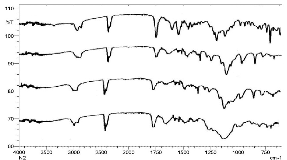 Soluplus shows a characteristic peak at 1750 cm-1 and 1650 cm-1 corresponding to the carbonyl–C = O group, 2747 and 2890 cm-1 for–C-H, and broadband in the range 3200-3400 cm-1 representing the terminal–OH groups. The spectrum of Kolliphor P 188 is characterized by strong absorption peaks at 2880 cm–1 signifying the aliphatic–C-H stretch, 1339 cm–1 (in-plane O-H bend), and 1098 cm–1 (C-O-stretch) Other absorption bands of NTG became indistinguishable. Formulation F 12 (NTG-soluplus-affinisol), and formulation F 15 (NTG-soluplus-sylloid 244), showed very similar IR spectra. Comparative graphs of some ternary dispersion are shown in the following fig. 2.