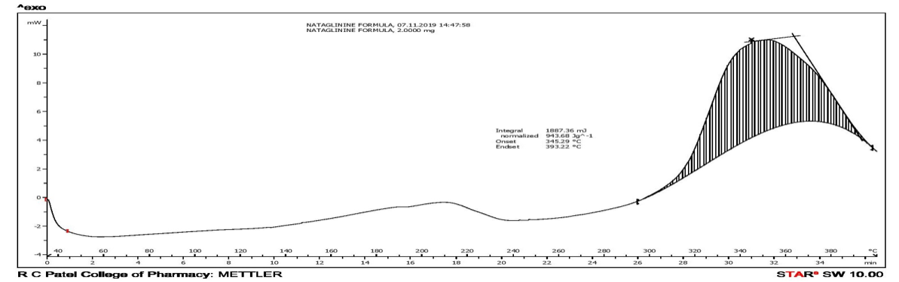 DSC thermograms of pure NTG and the optimized NTG-ternary dispersion are shown in fig. 4. The DSC curve of pure NTG exhibited a single endothermic peak at 130 °C, which indicates its melting point. Thus NTG exhibited in crystalline Form. The characteristic peak of the pure drug disappeared in the thermogram of ternary dispersions. This indicates a molecular dispersion of NTG in ternary dispersions. The total disappearance of the drug melting peak indicates the occurrence of the amorphous nature of NTG in ternary dispersions. The exothermic peak for the NTG-ternary dispersion was observed at 345.29 °C.