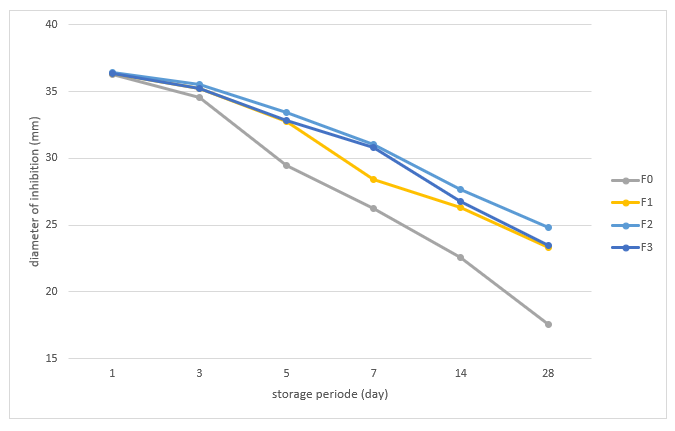 | Formula | Diameter of inhibition (mm) during the storage periode (day) | |||||