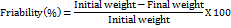 Pre-weighed tablets (n=10) were placed in Roche friabilator which was then operated for 100 revolutions (25 rpm, 4 min). The tablets were then dusted and reweighed to check the loss in its weight. The friability (%) was calculated using the following equation.