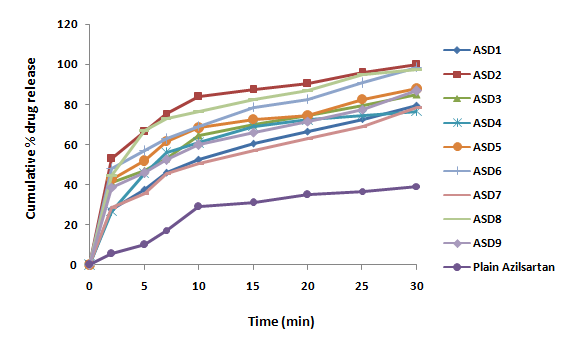 The results of in vitro dissolution study are shown in fig. 3. It showed that % drug releases of all batches within 30 min are enhanced as compared to plain Azilsartan. Results also indicated that, as the concentration of soluplus increases, drug release also increases. Batch ASD-2 containing 40 mg Azilsartan and 80 mg of Soluplus showed maximum drug release i.e. 99.82 % within 30 min.