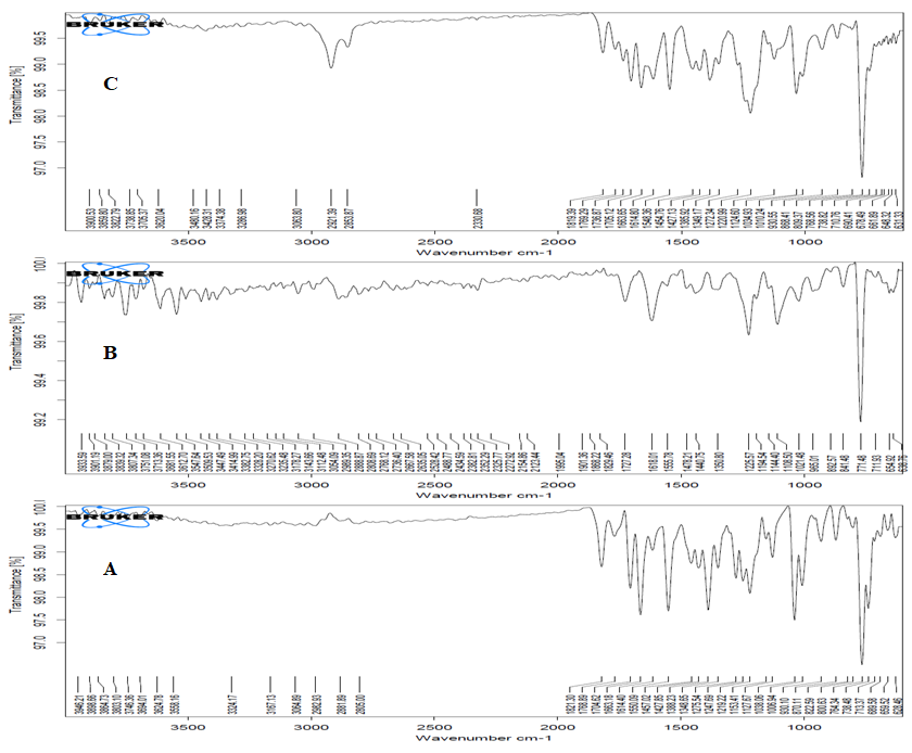 Fig. 4: FTIR spectrum of A: Azilsartan, B: Soluplus, C: Formulation ASD-2