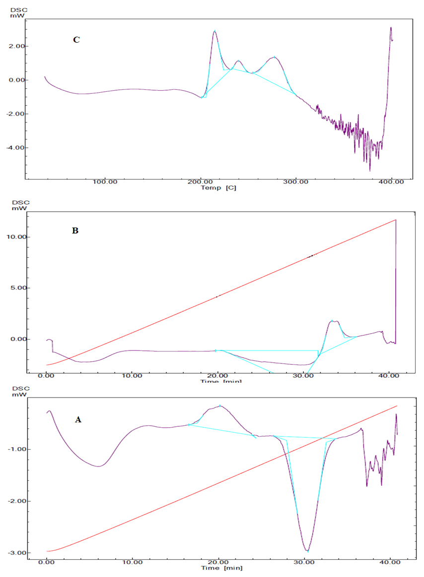Fig. 5: DSC thermogram of A: Azilsartan, B: Soluplus, C: Formulation ASD-2