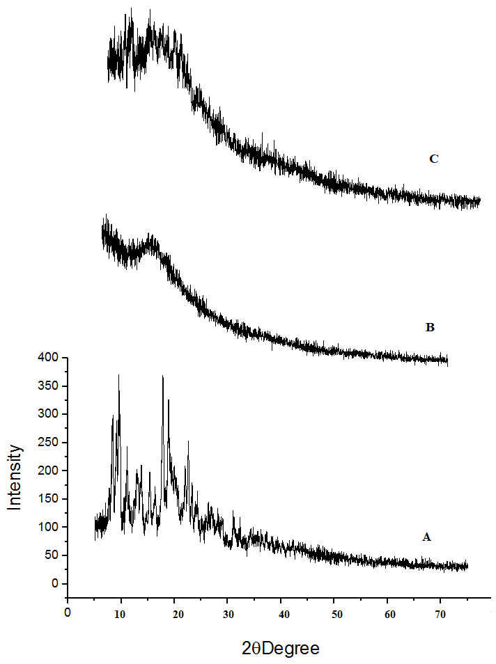 Fig. 6: XRD of A: Azilsartan, B: Soluplus, C: Formulation ASD-2