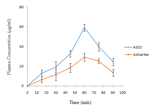 Fig. 7: Plasma concentration-time profile of ASD2 and Azilsartan (All value represents mean±SD (n=3))