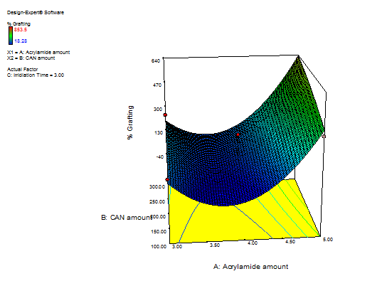 Fig. 3 showed the interaction effect of acrylamide amount and ceric ammonium nitrate (CAN) amount on % grafting. It was observed that as the concentration of acrylamide increased % grafting also increased significantly. However, ceric ammonium nitrate (CAN) amount had no significant effect on the % grafting. Fig. 4 showed the interaction effect of acrylamide amount and irradiation time on % grafting. It was observed that as the concentration of acrylamide increased % grafting also increased significantly. However, irradiation time had no significant effect on % grafting. Fig. 5 showed the interaction effect of ceric ammonium nitrate (CAN) amount and irradiation time on % grafting. It was observed that as the concentration of ceric ammonium nitrate (CAN) amount and irradiation time had no significant effect on the % grafting [7, 8].