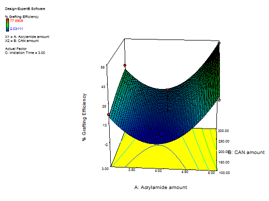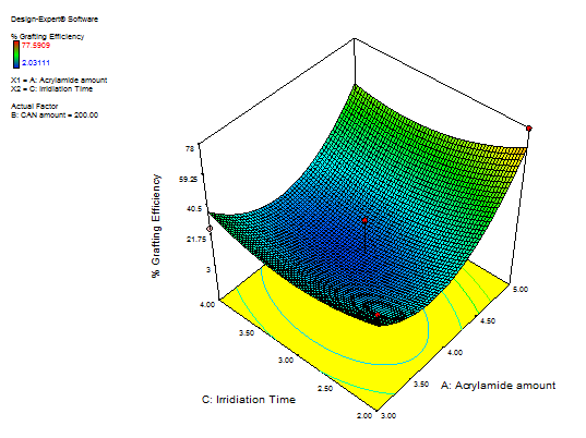 Fig. 6 showed the interaction effect of acrylamide amount and ceric ammonium nitrate (CAN) amount on % grafting efficiency. It was observed that as the concentration of acrylamide increased % grafting also increased significantly. However, ceric ammonium nitrate (CAN) amount has no significant effect on % grafting efficiency. Fig. 7 showed the interaction effect of acrylamide amount and irradiation time on % grafting efficiency. It was observed that as the concentration of acrylamide increased %, grafting also increased significantly. However, Irradiation time had no significant effect on the % grafting efficiency. Fig. 8 showed the interaction effect of ceric ammonium nitrate (CAN) amount and irradiation time on % grafting efficiency. It was observed that ceric ammonium nitrate (CAN) amount and Irradiation time have no significant effect on the % grafting efficiency [7, 8].
