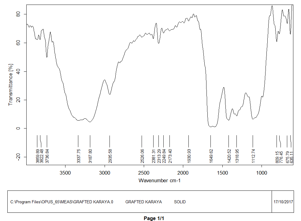 The FTIR spectra of grafted karaya gum (fig. 11) showed a very broad spectrum band at 3337.75, which confirms the grafting by overlapping of the OH group of karaya with the NH group of acrylamide. This FTIR studies have been supported by the literature [21, 25].