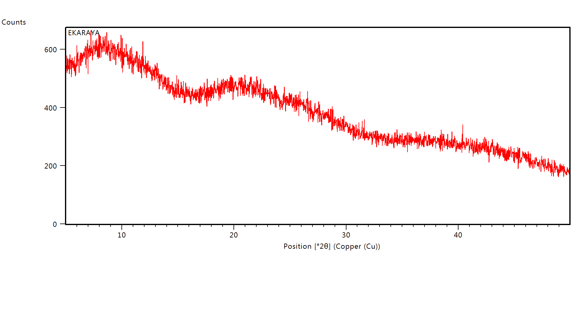 The X-ray diffraction spectra showed the amorphous nature of gum karaya (fig. 12) as no characteristic peak was observed. The XRD spectra of acrylamide (fig. 13) confirmed its crystalline nature. However, the XRD spectra of grafted gum (fig. 14) showed less intense peaks but crystalline, which confirmed the grafting of acrylamide onto the surface of gum and which have also been confirmed by literature [26, 27].