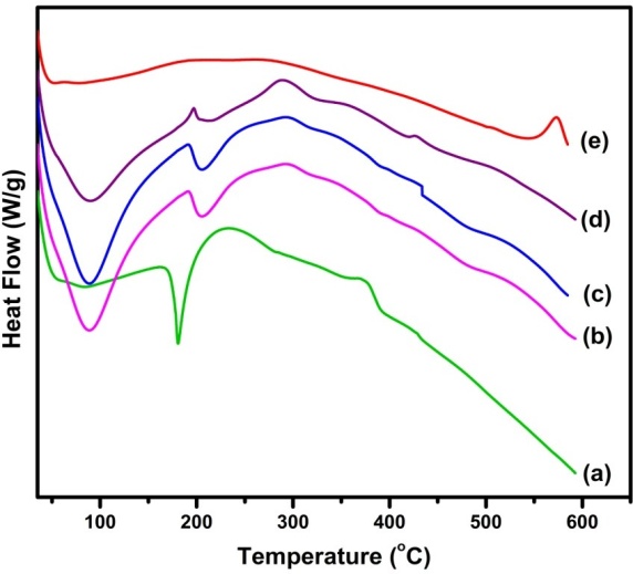 Fig. 2: DSC curves of CUR (a), placebo microbeads (b), drug loaded microbeads (c), MNPs-drug loaded microbeads (d) and MNPs (e)