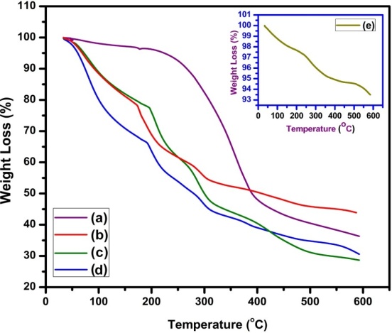 Fig. 3: TGA curves of CUR (a), placebo microbeads (b), drug loaded microbeads (c), MNPs-drug-loaded microbeads (d) and MNPs (e)