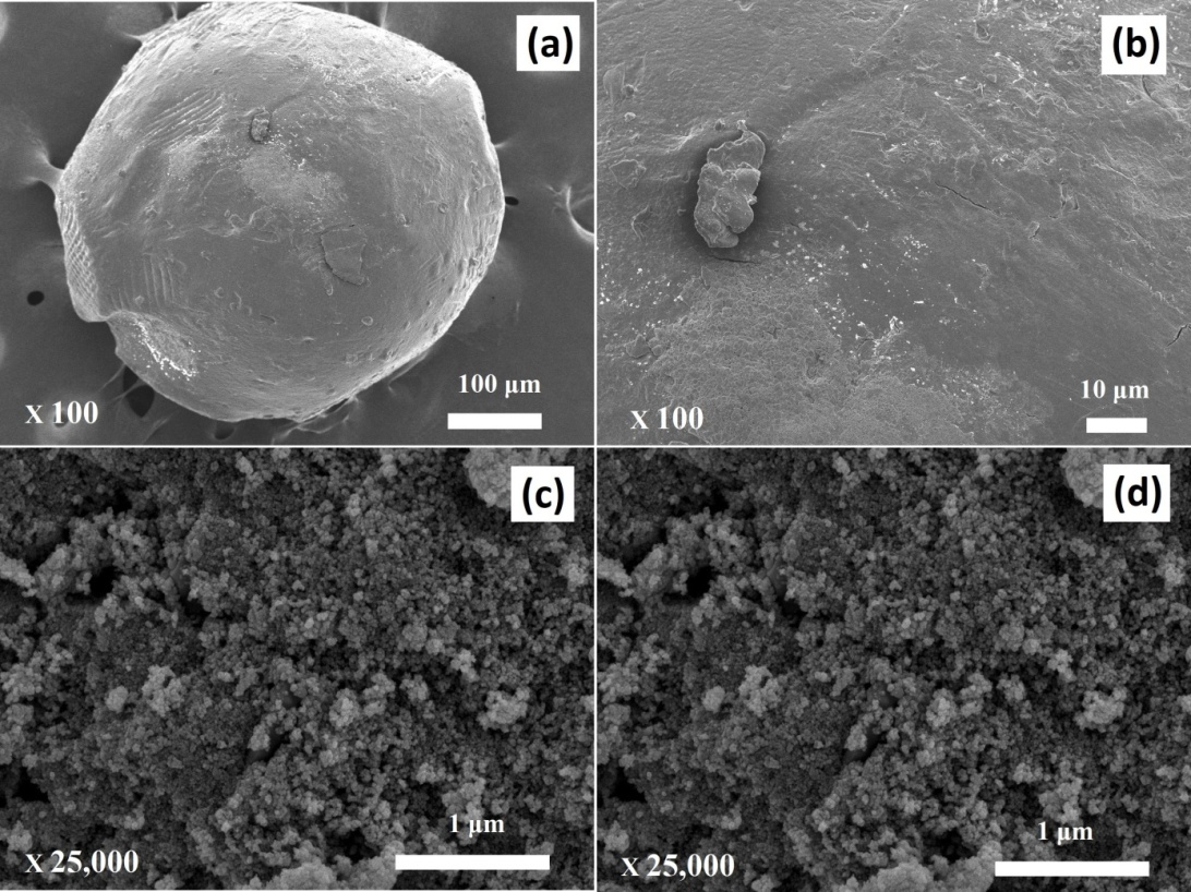 Fig. 4: SEM analysis of drug and MNPs loaded microspheres (a, b), synthesized magnetic nanoparticles (c, d)