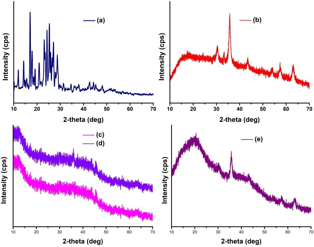 Fig. 5: X-RD patterns of CUR (a), MNPs (b), placebo microbeads (c), drug loaded microbeads (d) and MNPs-drug loaded microbeads (e)