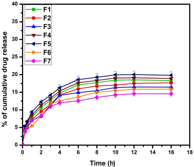 Fig. 7: Cumulative % of drug release in pH 1.2 at 37 °C, (Results are expressed as mean±SD, n=3)