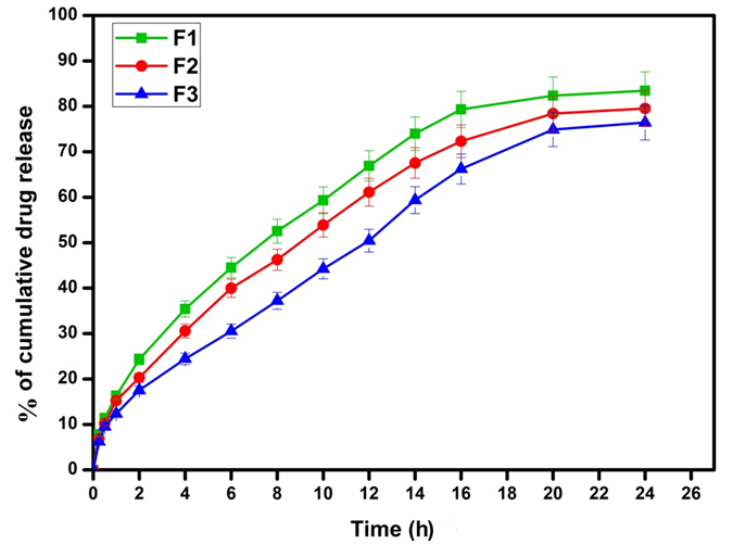 Cumulative % of drug release was influenced by changing the polymer blend ratio at constant drug content (100 mg) and crosslinker content (1 ml). From the fig. 8 it was clearly observed that as the content of PVP-co-VAc increased, the cumulative % of drug release decreased. This trend is observed in the formulations of F1 (80:20), F2 (60:40) and F3 (40:60).
