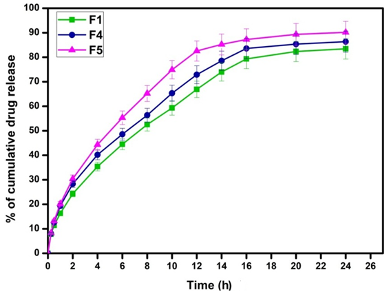 The effect of drug content on cumulative % of drug release rate was observed by varying the drug content at constant polymer blend ratio (80:20) and crosslinker content (1 ml). The effect of drug content was observed in the formulations F1 (100 mg), F4 (150 mg) and F5 (200 mg) and the results are displayed in fig. 9. The formulation F5 shows a higher release rate than the F4 and F1; thus it was concluded that the release depends on the drug present in the matrices i.e., higher the drug, higher is the drug release rate and vice-versa. In other words, lower the amount of drug, lower the drug release rate was observed due to the availability of more free void spaces through which a lesser number of drug molecules could be transported [38].