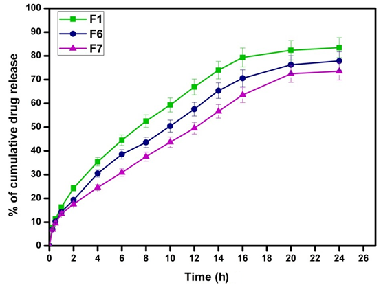 The effect of crosslinker on the % of drug release rate for formulations F1, F6 and F7 are investigated and the results are displayed in fig. 10. It was clearly noticed that the % of drug release rate of F1 (GA-1 ml) is higher than the F6 (GA-2.5 ml) and F7 (GA-5 ml), because as the crosslinker content increases the % of drug release rate decreases. As the crosslinker content increases, the polymer network becomes more rigid; hence the drug molecules have less chance to escape from the polymer matrix; therefore, the drug release rate decreases [39].