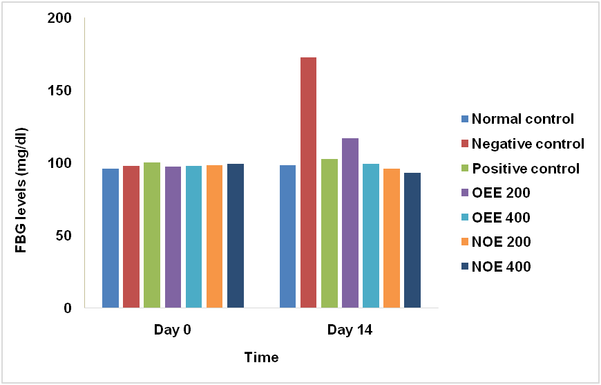 The mice were acclimated to laboratory conditions for a week before behavioral monitoring, under conditions of 12 h light-dark cycle, 70%±2 relative humidity, and a temperature of 22±2 °C. Thirty-five male mice were divided into seven groups of five mice each. The normal control group (Group 1) consisted of non-diabetic mice. For the induction of hyperglycemia, mice in the diabetic groups were intraperitoneally injected (i. p.) with alloxan at a concentration of 200 mg/kg body weight (BW). The hyperglycaemic mice were divided into six equal groups of five animals each: an untreated group as a negative control (Group 2); a group treated with 0.62 mg/kg BW of glibenclamide as a positive control (Group 3); two groups that received OEE, one at a dose of 200 mg/kg BW (Group 4) and the other at 400 mg/kg BW (Group 5); and two groups that received NOE, one at a dose of 200 mg/kg BW (Group 6) and the other at 400 mg/kg BW (Group 7). Glibenclamide, OEE, and NOE were administered orally for 14 d.