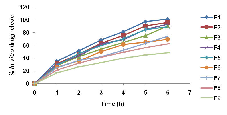 The prepared tablets were smooth and white in color. Weight variation in case of all tablets was acceptable. The weight variation in case of all the tablets was within±2.5% of theoretical tablet weight. This falls well within the acceptance criteria. Hardness value of all the formulation was in the range of 5.54-6.43 kg/cm2. The prepared tablets showed in range thickness of 1.92-2.14 mm. Percentage of drug content for all formulations was found to be between 99.54% and 102.82%. Friability in case of all the designed tablets was less than 1% indicating suitability of the method used for manufacturing the tablets.
