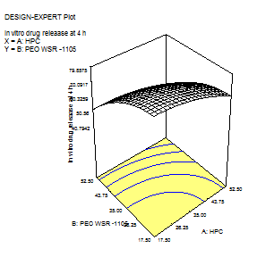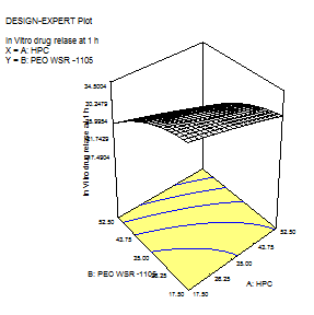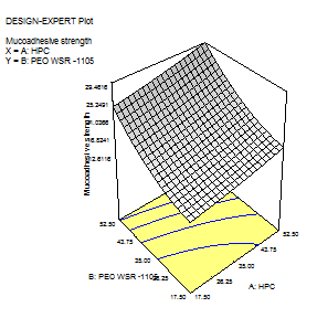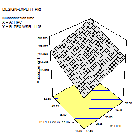 Conclusion: From all parameters and experimental design evaluation, it was concluded that the drug release rate decreased with an increase the concentration of HPC and PEO WSR-1105 and mucoadhesion property increased with increase the concentration of PEO WSR-1105. The in vitro release kinetics revealed the Korsmeyer-Peppas model is followed and drug release is by anomalous diffusion.