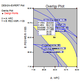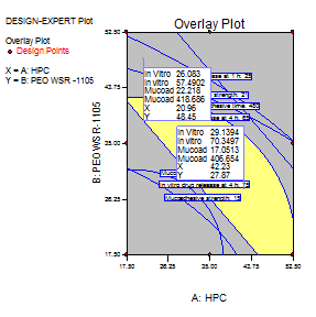 Checkpoint batch C1 and C2 were selected from the overlay plot of responses. The amount of HPC and PEO WSR-1105 and according to their amounts, the predicted responses were given in the Overlay plot flag or in the solution of overlay data. From that, any two batches C1 and C2 were selected for the verification of the model [17].