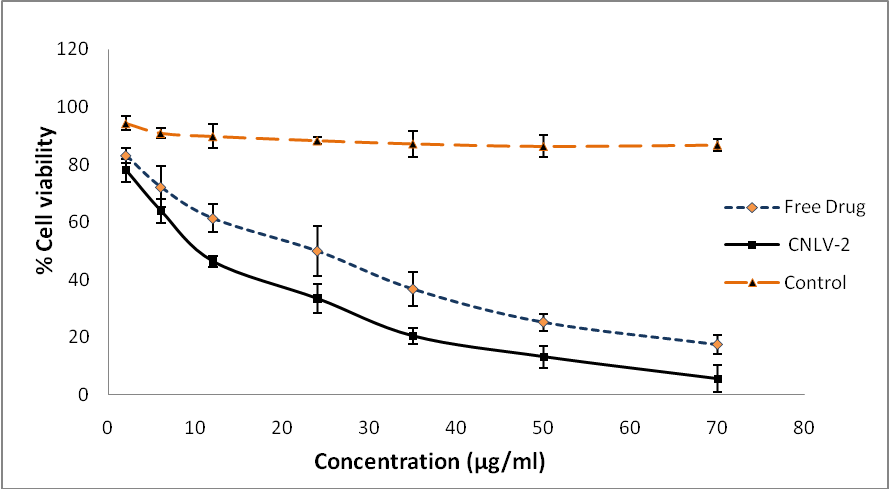 Fig. 5: Comparison of U87MG cell viability (%) upon treatment with optimized formulation (CNLV-2), free drug, and blank NLVs. Data show mean±SD (n =3)