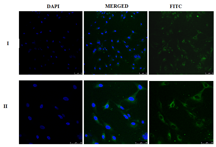 Fig. 6: I. Confocal laser microscopic images of U87MG human glioblastoma cells treated with FITC-CNLV-2 (0.5 h incubation); II. Images were taken at higher magnification