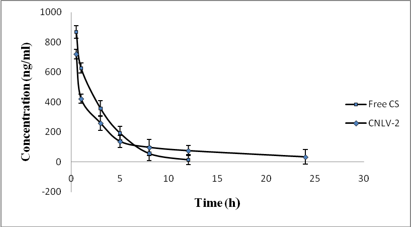PK study was carried out on Swiss albino mice of body weight 20-25 g. The animals were divided into three groups. Each group was having 6 animals. Group I animals were intravenously administered CS suspension (10 mg/kg body weight). Group II animals were intravenously administered CNLV-2, containing CS equivalent to 10 mg/kg. Group III animals received saline (control group). For the study, post intravenous dosing, blood samples were collected from each animal at 0.5, 1, 3, 5, 8, 12, 18, 24 h intervals by heart puncture in pre-heparinized tubes. The blood samples were centrifuged using cold centrifuge at 5000 rpm for 10 min. Plasma was collected and stored at-40 °C till analysis.