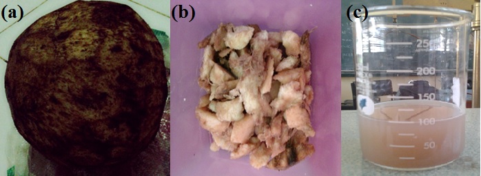 Fig. 1: Musa acuminata Colla (a) corm, (b) sliced corm, and (c) corm extract