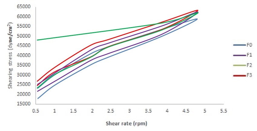 Fig. 3: The result of rheology tests of the shampoo formulas prepared with Musa acuminata corm extract. F0 formula did not include the extract, and F1, F2 and F3 consisted of 8%, 10% and 12% extract, respectively