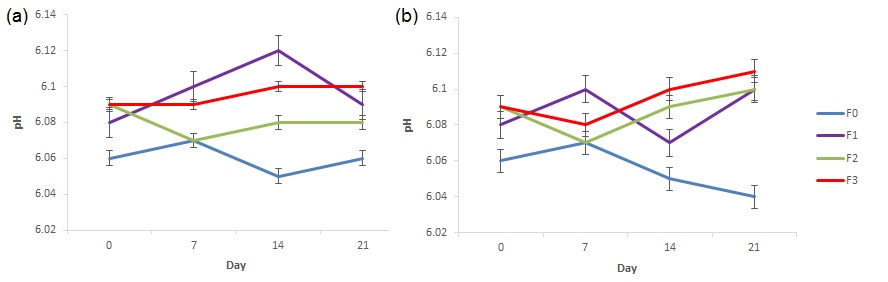 Fig. 4: pH of the shampoo formulas prepared with Musa acuminata corm extract at (a) room temperature and (b) 60 °C. F0 formula did not include the extract, and F1, F2 and F3 consisted of 8%, 10% and 12% extract, respectively