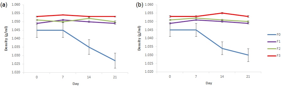 Fig. 5: Density of the shampoo formulas prepared with Musa acuminata corm extract at (a) room temperature, and (b) 60 °C. F0 formula did not include the extract, and F1, F2 and F3 consisted of 8%, 10% and 12% extract, respectively