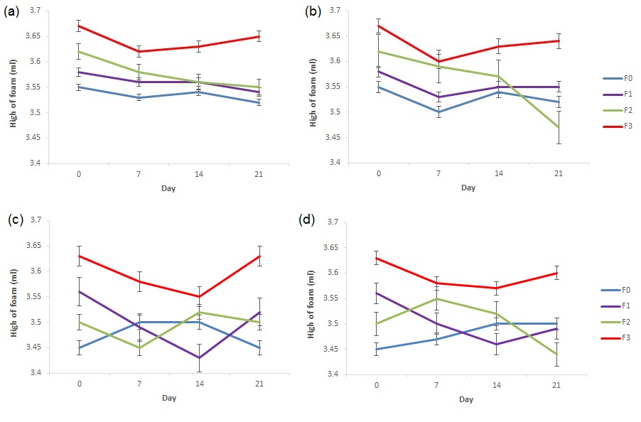 Fig. 7: The stability of foam height of shampoo formulas prepared with Musa acuminata corm extract at (a) 20 s after shaking at room temperature; (b) 20 s after shaking at 60 °C; (c) 5 m aging after shaking at room temperature; and (d) 5 m aging after shaking at 60 °C. F0 formula did not include the extract, and F1, F2 and F3 consisted of 8%, 10% and 12% extract, respectively