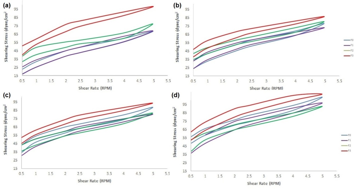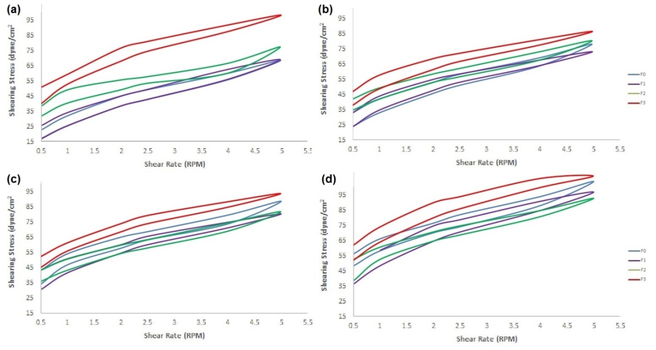 Fig. 8: The rheology of shampoo formulas prepared with Musa acuminata corm extract stored at room temperature: (a) at day 0; (b) at day 7; (c) at day 14; and (d) at day 21. F0 formula did not include the extract, and F1, F2 and F3 consisted of 8%, 10% and 12% extract, respectively