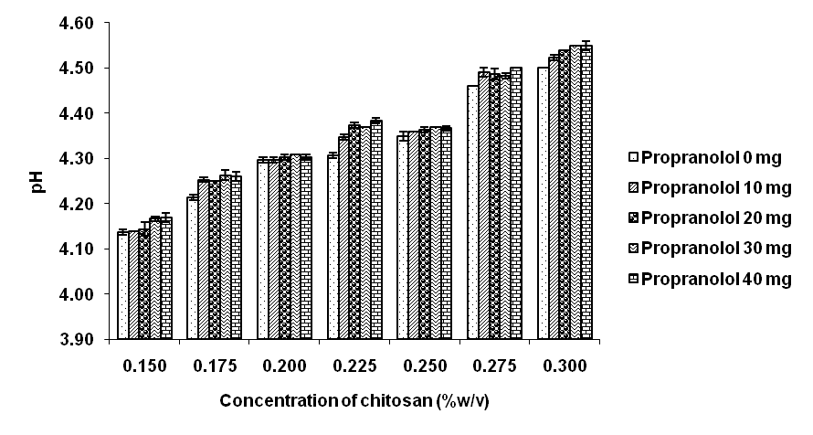 Fig. 1: Effect of chitosan and propranolol concentrations on the pH values of the nanoparticles (mean±SD, n=3)