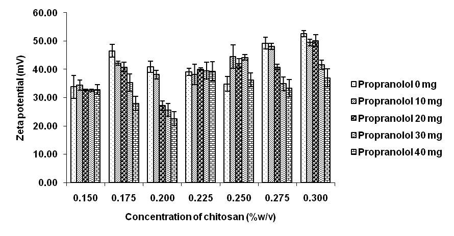 At the same concentration of chitosan, the zeta potential tended to decrease with increasing amounts of propranolol. This result was in accordance with a previous study that reported that decreasing zeta potentials when propanolol was included at concentrations greater than 2-fold the concentration of chitosan [1]. Reduced zeta potential with additional drug quantities was also observed in anion drug-loaded nanoparticles [10, 23], due to the potential interactions between the cations in the chitosan amino groups and the anion in propranolol. Therefore, the nanoparticle formation with TPP may be disrupted, leading to reduced positive charges on the nanoparticle surface. At fixed propranolol concentrations, the zeta potential fluctuated with changing chitosan concentrations. However, the zeta potentials of nanoparticles containing greater than 0.2% chitosan tended to increase. This result agreed with those reported by Al-Kassas et al., who reported that the zeta potential increased with increased chitosan concentrations, due to the cationic nature of chitosan [1].