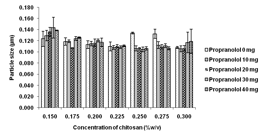 Fig. 3: Effect of chitosan and propranolol concentrations on the particle size of the nanoparticles (mean±SD, n=3)